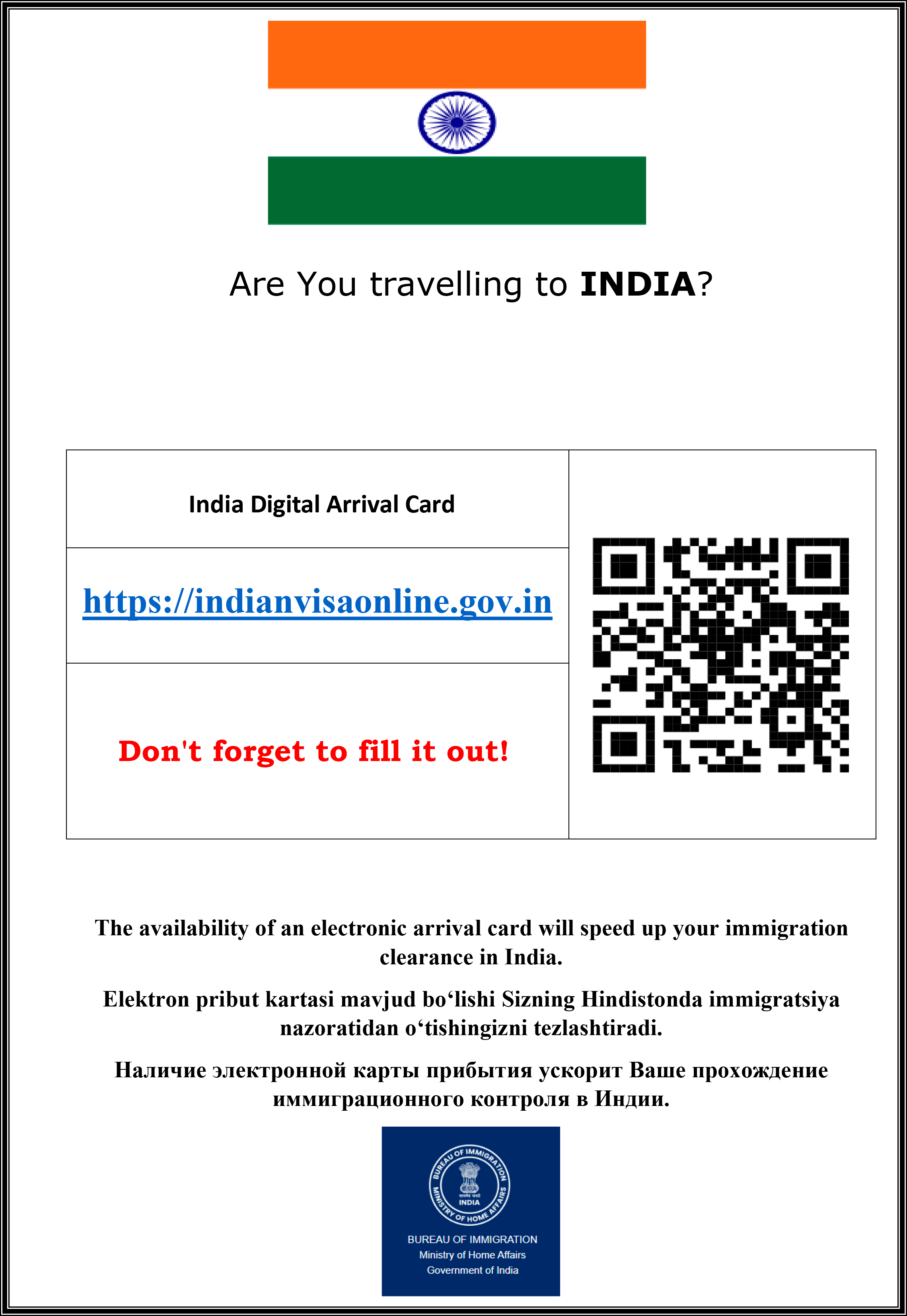 From October 1, 2025, passengers visiting India will need to fill out an online Disembarkation Card (electronic arrival cards) 72 hours before arrival in India to avoid delays at immigration control desks and simplify the immigration process.