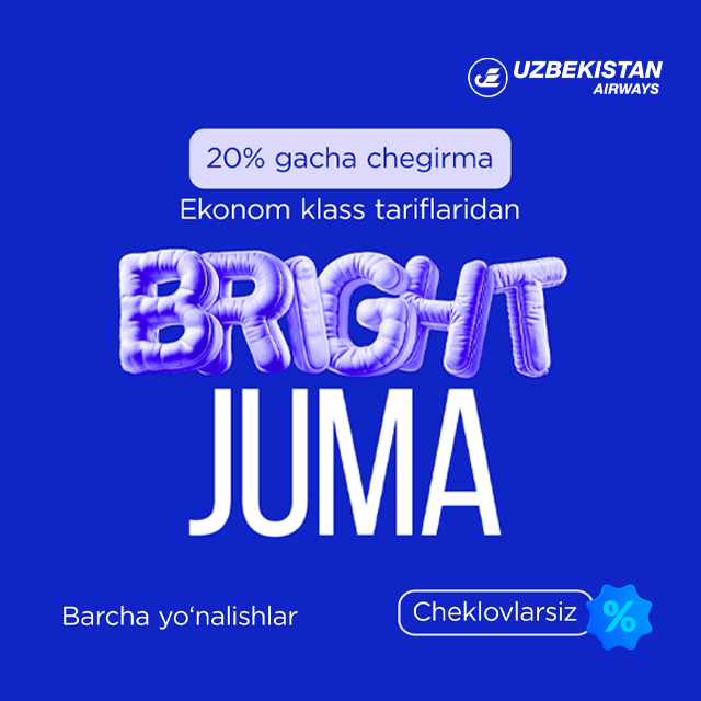 Uzbekistan Airways дарит вам лучший повод для путешествий! Мы объявляем "Bright пятницу" — специальную трехдневную акцию, в рамках которой вы получаете скидку до 20% от тарифов экономического класса! Более 200 000 авиабилетов по более чем 100 направлениям уже ждут вас: