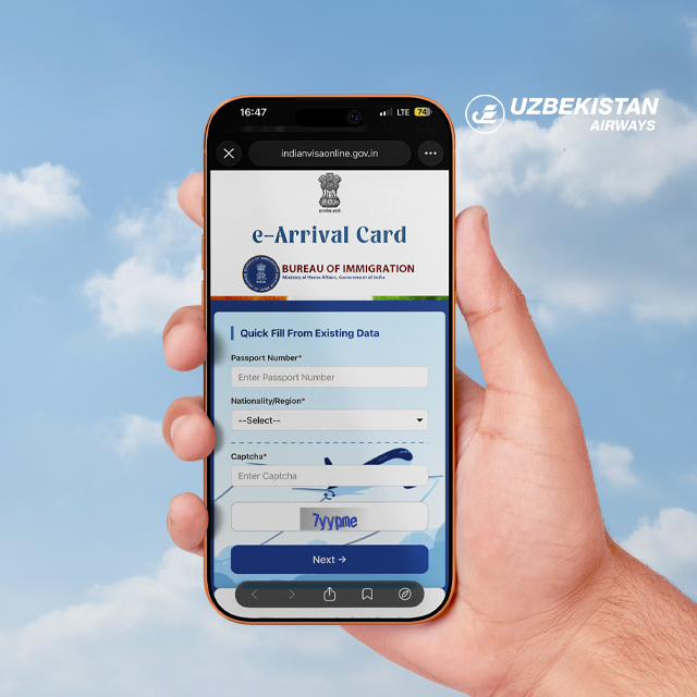 Agar siz Uzbekistan Airways aviaqatnovlari bilan Dehli yoki Mumbayga uchishni rejalashtirayotgan bo‘lsangiz, pasport nazoratidan o‘tishda kechikishlarning oldini olish uchun, iltimos, kelish elektron kartasini oldindan to‘ldiring.