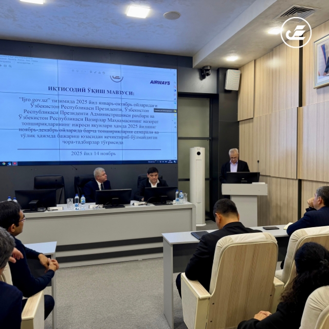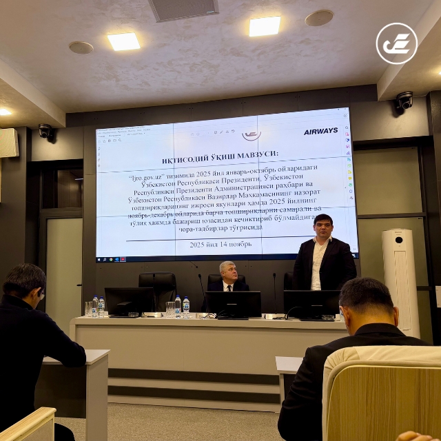 Oʻzbekiston Respublikasi Bosh vaziri maslahatchisining 2025-yil 27-oktabrdagi 07-15-18-son topshirig‘iga muvofiq, joriy yilning 14-noyabr kuni “Uzbekistan Airways ” AJda “Ijro.gov.uz” tizimida 2025-yil yanvar-oktabr oylaridagi O‘zbekiston Respublikasi Prezidenti, O‘zbekiston Respublikasi Prezidenti Administratsiyasi rahbari va O‘zbekiston Respublikasi Vazirlar Mahkamasining nazorat topshiriqlarining ijrosi yakunlari hamda 2025-yilning noyabr-dekabr oylarida barcha topshiriqlarni samarali va to‘liq hajmda bajarish yuzasidan kechiktirib bo‘lmaydigan chora-tadbirlar to‘g‘risida”gi mavzuda iqtisodiy o‘qish oʻtkazildi.